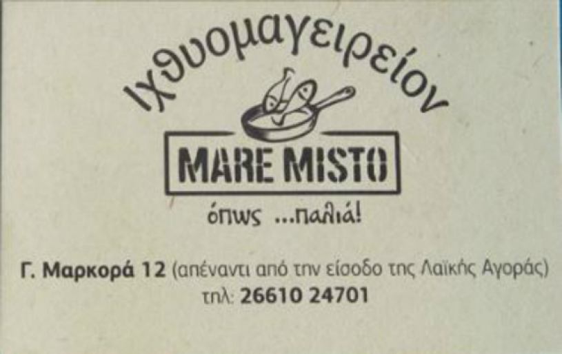 Έτσι το ιχθυομαγειρείο Mare Misto, είναι ξανά κοντά σας και σερβίρει φρέσκα ψαράκια και θαλασσινά όπως παλιά. Με νέο προσωπικό και νέα διεύθυνση, το Mare Misto σας περιμένει για γρήγορο, ποιοτικό φαγητό και καλή παρεούλα.