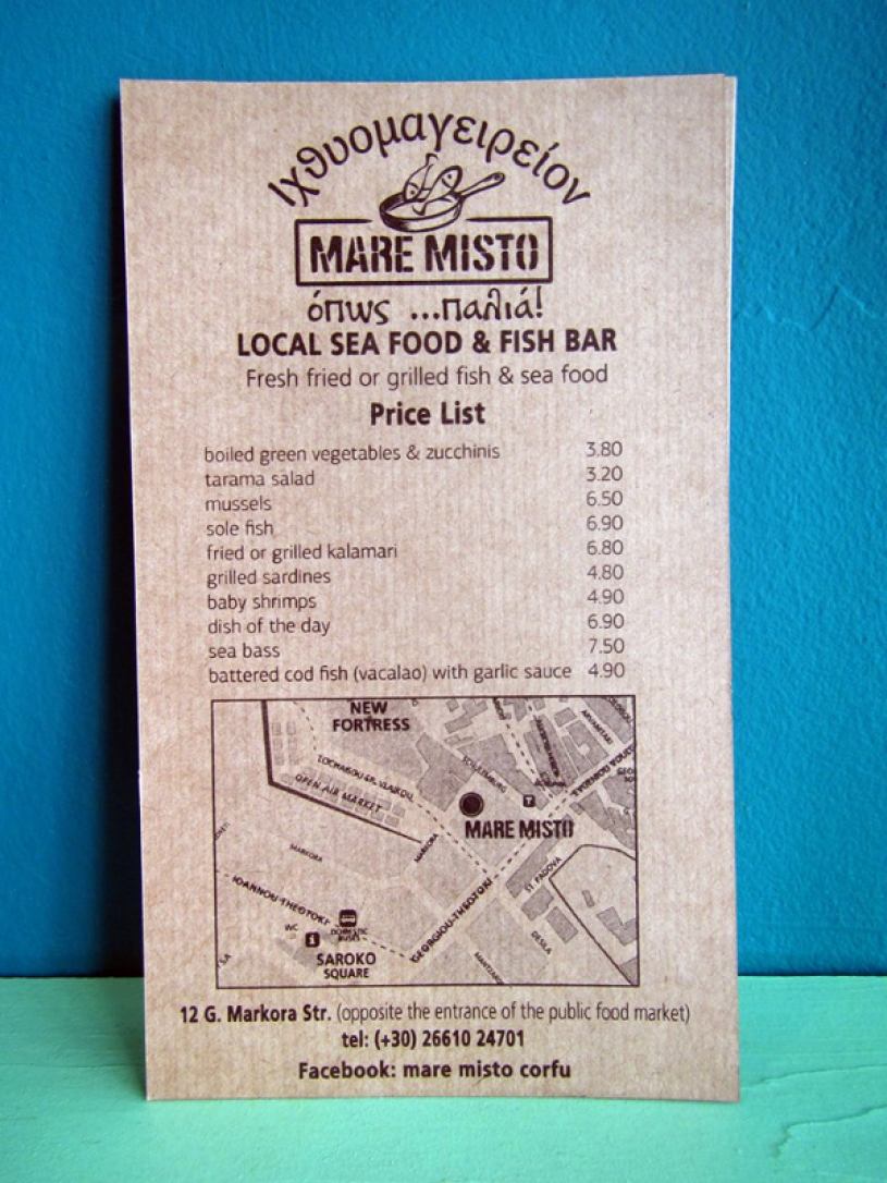 Το ιχθυομαγειρείο Mare Misto, ανακαινισμένο και ανανεωμένο, στο κέντρο της πόλης, κοντά στη λαϊκή αγορά, αναβιώνει μια περασμένη εποχή στην Κέρκυρα.