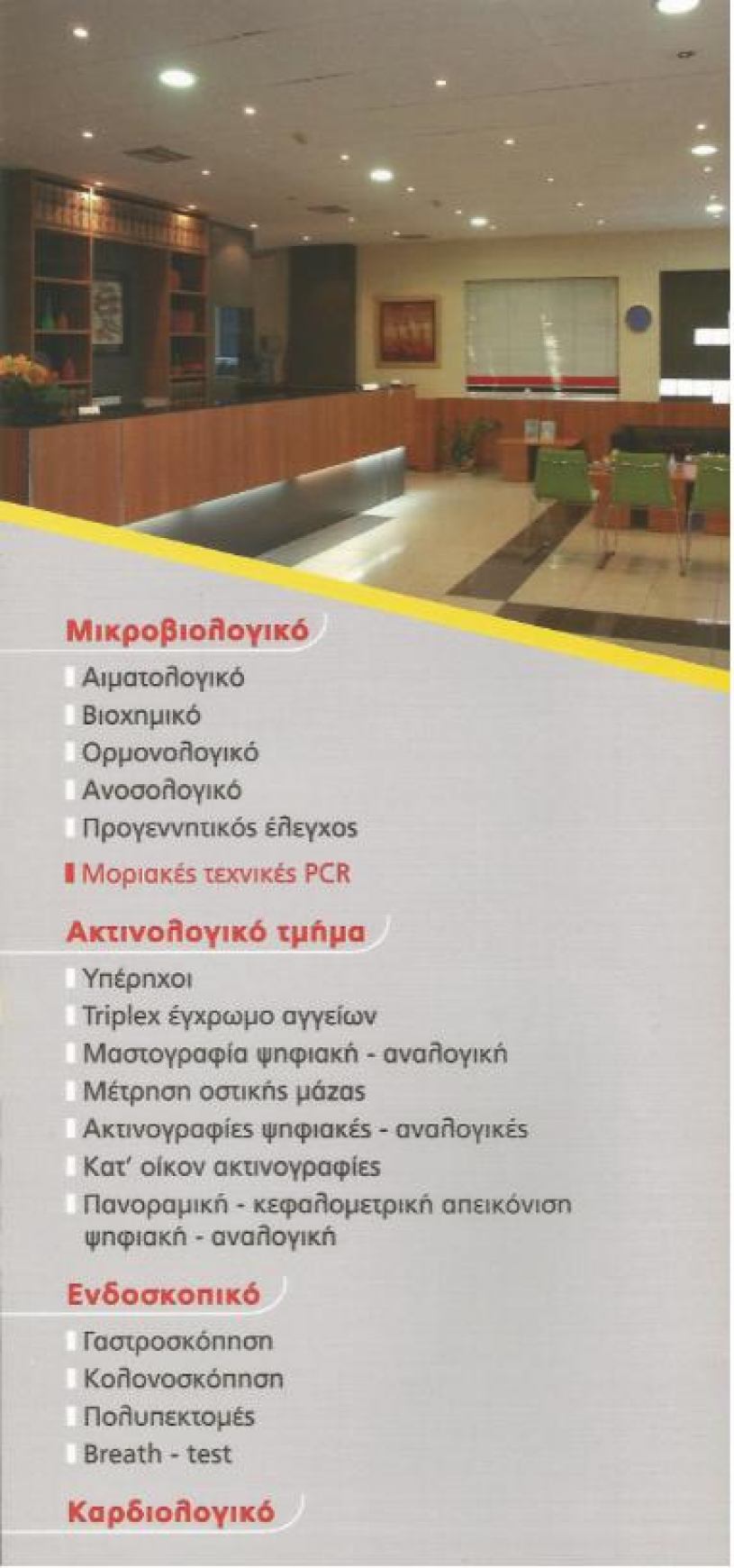 Ακτινολογικό: Υπέρηχοι, Triplex, Μαστογραφία ψηφιοποιημένη, Μέτρηση οστικής μάζας, Ακτινογραφίες ψηφιοποιημένες, Πανοραμική-κεφαλομετρική απεικόνιση ψηφιοποιημένη